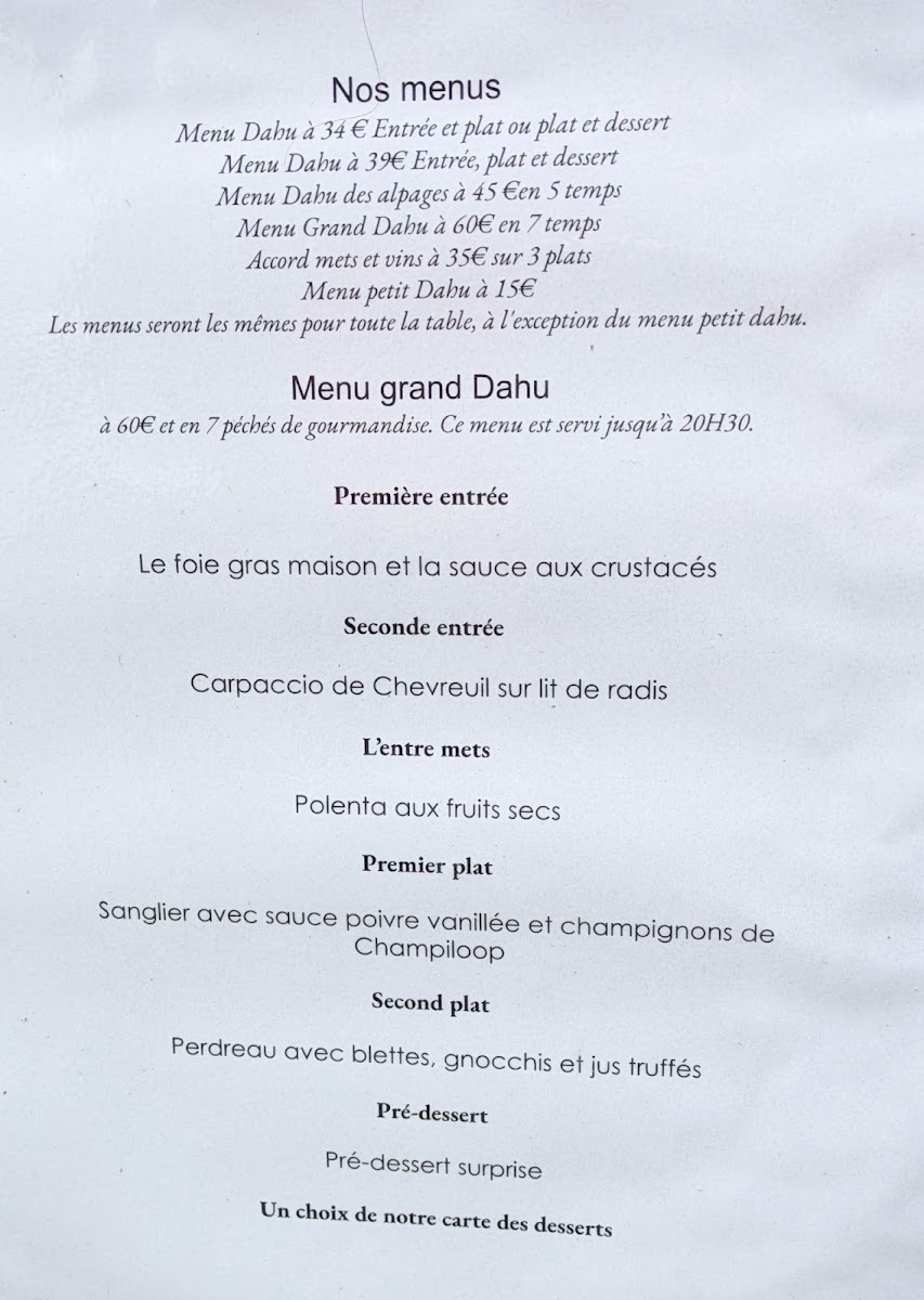 One of the standout features of Restaurant Dahu is its thoughtful menu selection. Diners can explore a curated menu du jour, which showcases fresh, high-quality ingredients, with the bread often being a highlight for many—richly praised for its flavor and texture. As noted by patrons like Vera Shalaeva, the emphasis on fresh produce elevates the dining experience significantly, making you feel every bite is crafted with care.